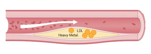 เมื่อมีการสะสมของสารพิษโลหะหนักบนเซลล์บุภายในผนังหลอดเลือด จะส8งผลใหAเกิดการสร้างอนุมูลอิสระ เพิ่มมากขึ้นบนผนังเซลล์ และไปเร่งกระบวนการอักเสบต่างๆ ทําให้Aการทํางานของเซลล์บริเวณผนังหลอดเลือด ผิดปกติ หลังจากนั้นไขมันคอเรสเตอรอล LDL ที่ลอยอยู่ในหลอดเลือดจะเริ่มจับบนผนังหลอดเลือด ทําให้รูหลอด เลือดตีบแคบลง ซึ่งกระบวนการเหล่านี้อาจส่งผลให้Aเกิดโรคเรื้อรังต่างๆตามมา อันได้แก่