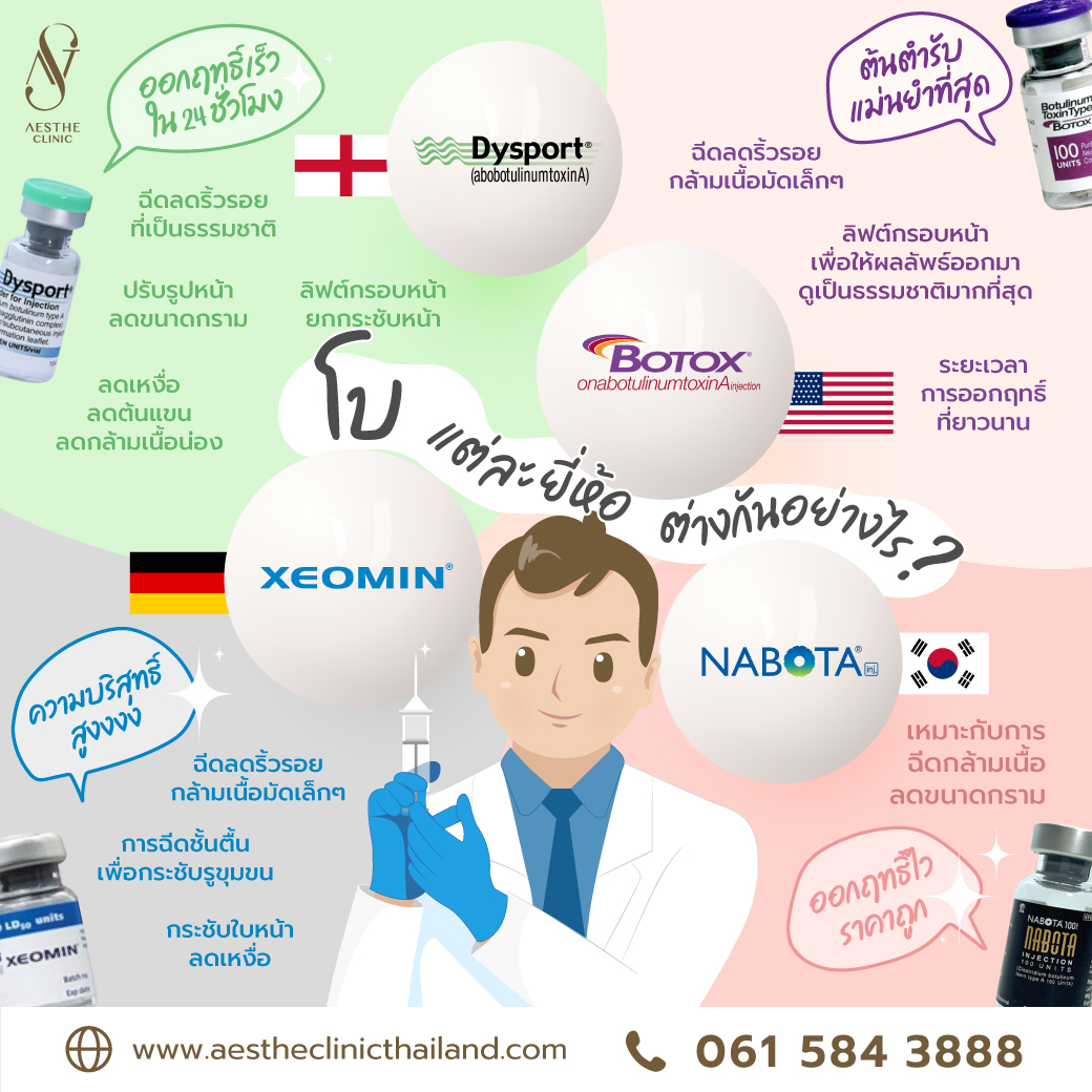 แนะนำให้เลือกฉีดโบทูลินั่ม ท็อกซิน ที่ผ่านการรับรองจากองค์การอาหารและยา ไม่แนะนำเด็ดขาดกับการใช้ของที่ไม่ได้มาตรฐานเพราะนั่นคือการสุ่มเสี่ยงต่อการเกิดอันตรายอย่างมาก และที่สำคัญควรฉีดโดยแพทย์หรือโรงพยาบาลที่มีความเชี่ยวชาญและได้มาตรฐานเท่านั้น