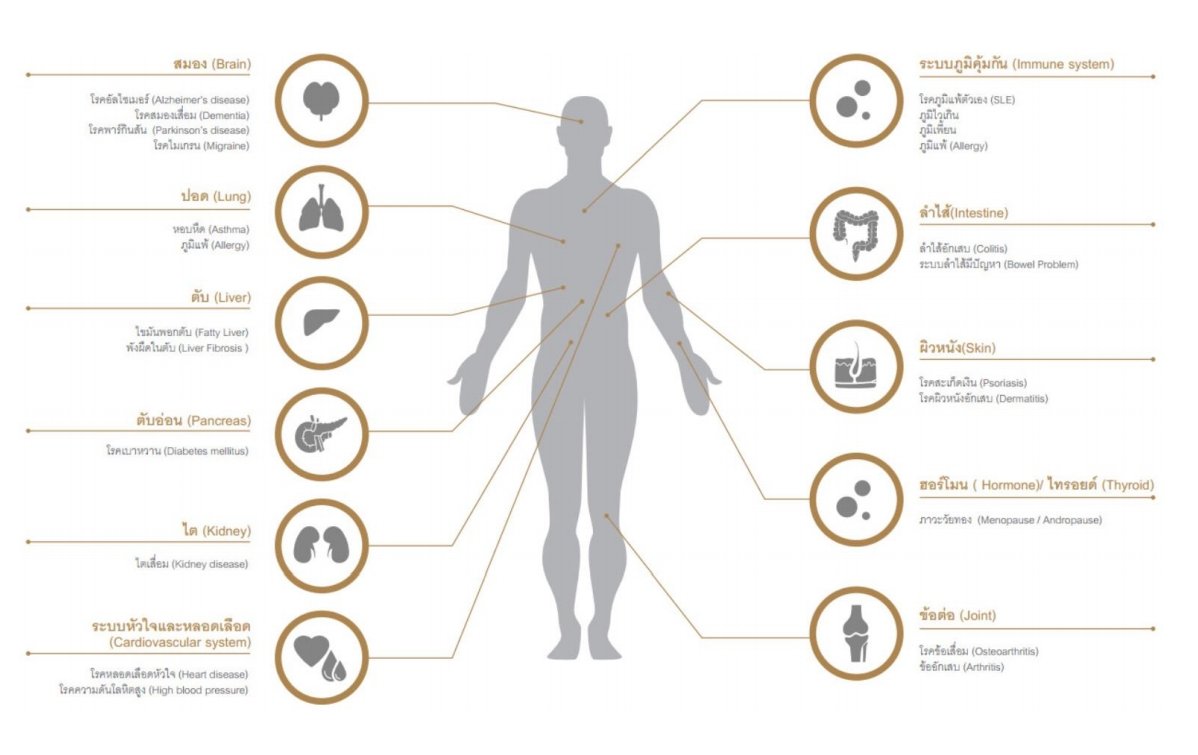 2. เซลล์ต้นกำเนิดของเซลล์ร่างกาย (Mesenchymal stem cell) ใช้รักษาโรคที่เกิดจากความเสื่อมของเซลล์ของร่างกายตามวัยหรือเสื่อมสภาพที่เกิดจากโรค เช่น โรคหัวใจและหลอดเลือด โรคกระดูกและข้อ และผิวหนัง เป็นต้น